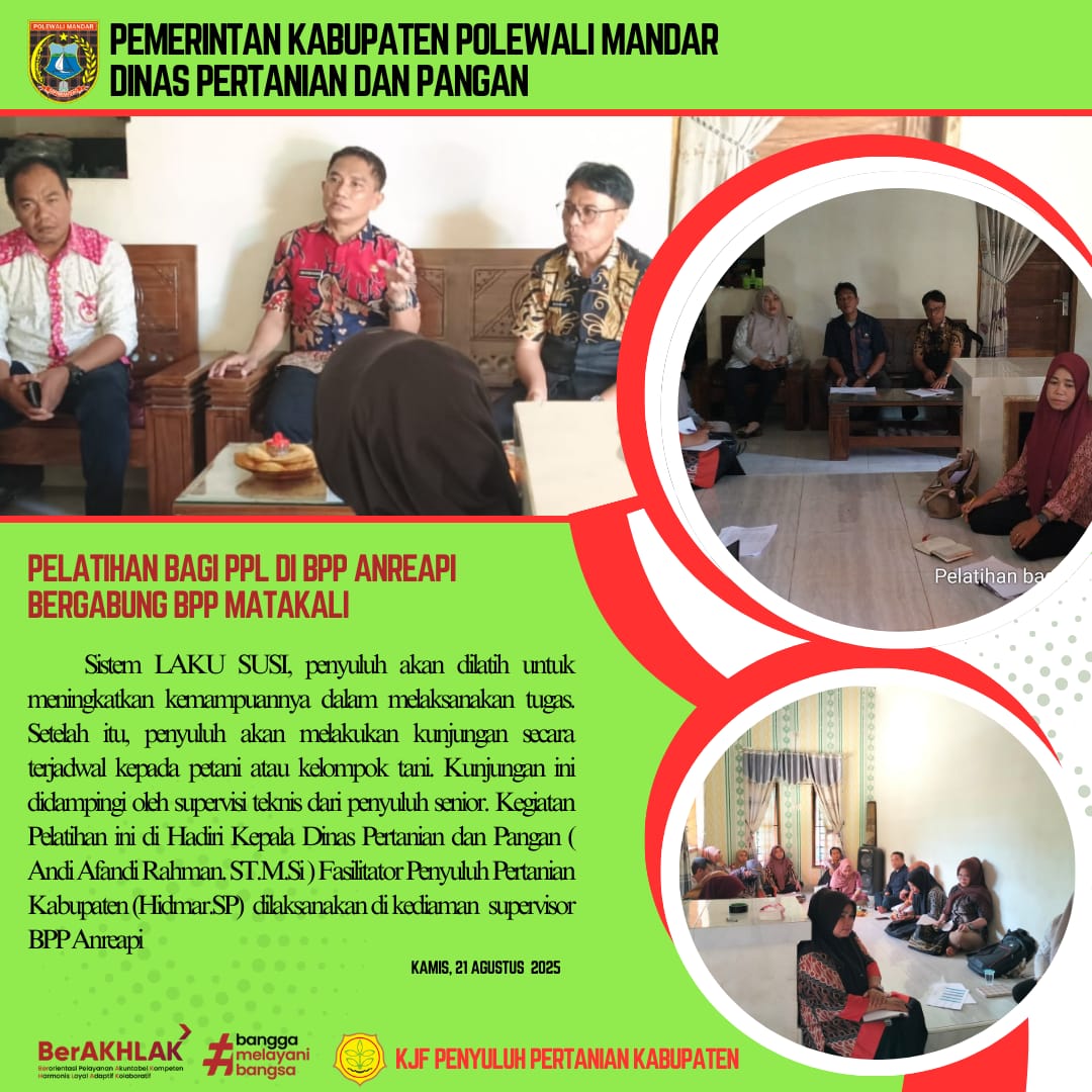 Polewali Mandar — Kepala Dinas Pertanian dan Pangan (Distanpan) Andi Afandi Rahman, S.T., M.Si memimpin rapat evaluasi bersama Balai Penyuluhan Pertanian (BPP) dari 16 kecamatan se-Kabupaten Polewal...