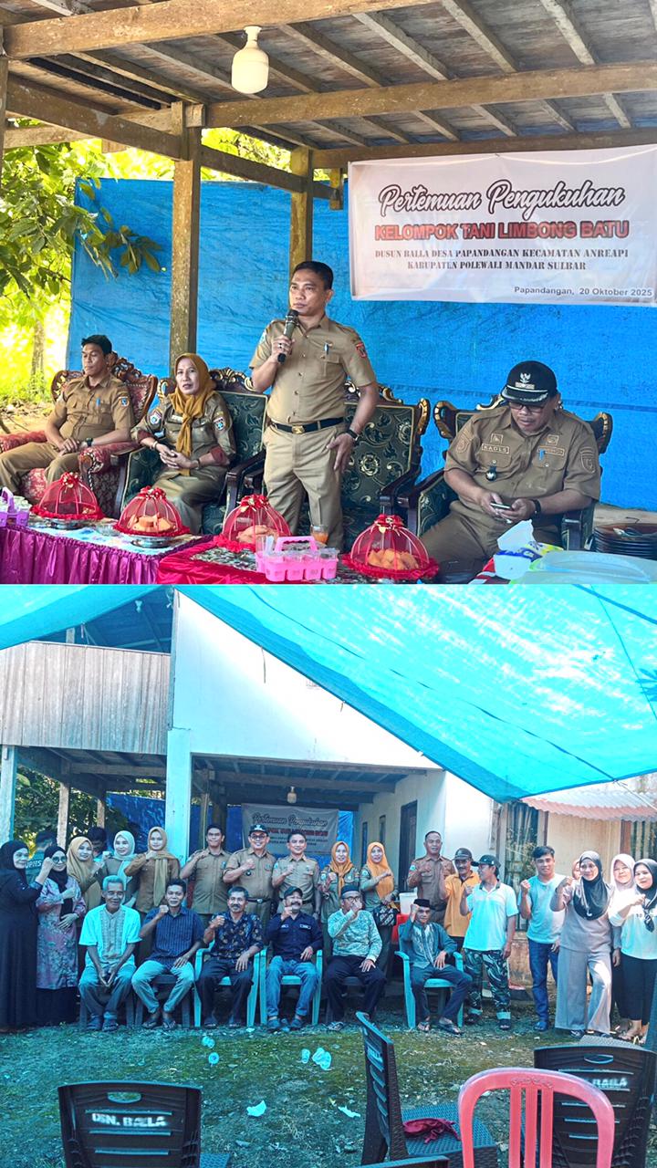 Pappandangan, 20 Oktober 2025 — Kepala Dinas Pertanian dan Pangan Kabupaten Polewali Mandar, Andi Afandi Rahman, S.T., M.Si., menghadiri sekaligus mengukuhkan Kelompok Tani Limbong Batu dalam kegiatan Pertemuan Pengukuhan Kelompok Tani yang digelar di Dusun Balla, Desa Pappandangan, Kecamatan Anreapi.Kegiatan ini turut dihadiri oleh jajaran Bidang Perkebunan Dinas Pertanian dan Pangan, Balai Penyuluhan Pertanian (BPP) Kecamatan Anreapi bersama para penyuluh pertanian lapangan, serta Kepala Desa Pappandangan, H. Makmur S., S.Sos., bersama perangkat desa dan anggota Kelompok Tani Limbong Batu.Dalam arahannya, Andi Afandi Rahman menyampaikan bahwa pengukuhan kelompok tani merupakan langkah strategis dalam memperkuat kelembagaan petani di tingkat desa. Melalui wadah kelompok tani, para petani diharapkan dapat lebih mudah berkoordinasi dan mengakses berbagai program pemerintah, seperti bantuan sarana produksi, pelatihan, dan pendampingan teknis dari penyuluh pertanian.“Kelompok tani adalah ujung tombak pembangunan pertanian di desa. Dengan kebersamaan dan semangat gotong royong, kita dapat mewujudkan pertanian yang maju, mandiri, dan modern di Polewali Mandar,” ujar Andi Afandi Rahman dalam sambutannya.Sementara itu, Kepala Desa Pappandangan, H. Makmur, S.Sos., menyampaikan apresiasi dan terima kasih kepada Dinas Pertanian dan Pangan atas perhatian dan dukungan yang diberikan kepada petani di wilayahnya. Ia berharap agar Kelompok Tani Limbong Batu dapat menjadi contoh bagi kelompok tani lainnya dalam meningkatkan produktivitas dan kesejahteraan masyarakat petani. Kegiatan diakhiri dengan penandatanganan berita acara pengukuhan kelompok tani dan foto bersama seluruh peserta, sebagai simbol kebersamaan dan komitmen untuk terus memajukan sektor pertanian di Kecamatan Anreapi dan Kabupaten Polewali Mandar secara berkelanjutan....