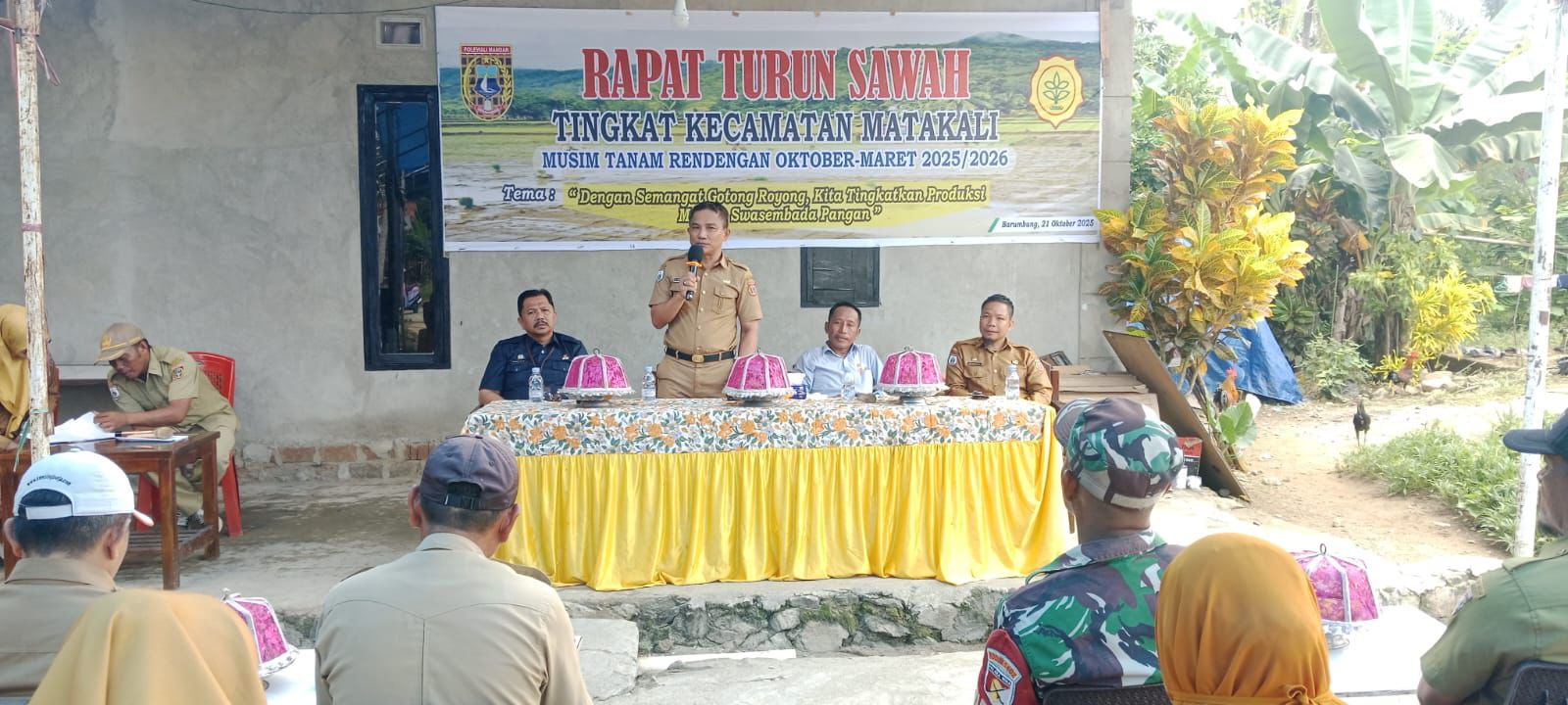 Matakali, 21 Oktober 2025 — Dinas Pertanian dan Pangan Kabupaten Polewali Mandar menghadiri kegiatan Rapat Turun Sawah Tingkat Kecamatan Matakali yang dilaksanakan di Desa Barumbung, Kecamatan Matakali. Kegiatan ini digelar dalam rangka menyambut Musim Tanam Rendengan Oktober–Maret Tahun 2025/2026.Dengan mengusung tema “Dengan Semangat Gotong Royong, Kita Tingkatkan Produksi Menuju Swasembada Pangan”, kegiatan ini dihadiri oleh Kepala Dinas Pertanian dan Pangan Kabupaten Polewali Mandar, Andi Afandi Rahman, S.T., M.Si, beserta jajaran Kepala Bidang lingkup Distanpan, BPP Kecamatan Matakali, para penyuluh pertanian, unsur pemerintah desa, Babinsa, serta kelompok tani dari berbagai desa di Kecamatan Matakali.Turut hadir pula Anggota Komisi II DPRD Kabupaten Polewali Mandar, H. Suardi, yang memberikan dukungan penuh terhadap program peningkatan produksi pertanian dan kesejahteraan petani di wilayah tersebut. Dalam sambutannya, beliau menegaskan pentingnya kolaborasi antara legislatif dan eksekutif dalam memperkuat sektor pertanian sebagai penopang utama perekonomian daerah.Dalam arahannya, Kepala Dinas Pertanian dan Pangan, Andi Afandi Rahman, menyampaikan bahwa rapat turun sawah merupakan momentum penting untuk memperkuat sinergi antar-stakeholder pertanian dalam menghadapi musim tanam tahun ini.“Turun sawah bukan hanya simbol dimulainya musim tanam, tetapi juga wujud sinergi antara pemerintah, penyuluh, dan petani. Dengan semangat kebersamaan, kita bisa memperkuat ketahanan pangan dan meningkatkan kesejahteraan petani,” ujar Andi Afandi Rahman.Beliau juga mengingatkan agar seluruh pihak memperhatikan efisiensi penggunaan air irigasi, kesiapan benih, serta ketersediaan pupuk agar produktivitas dapat optimal.Selain mendengarkan arahan dari Kepala Dinas dan anggota DPRD, kegiatan ini juga menjadi forum komunikasi antara penyuluh dan kelompok tani dalam membahas kesiapan lahan, pengendalian hama, serta penyaluran sarana produksi pertanian. Dinas Pertanian dan Pangan Kabupaten Polewali Mandar berkomitmen untuk terus mendampingi para petani melalui kegiatan penyuluhan, bimbingan teknis, dan penyediaan sarana produksi. Dengan semangat gotong royong dan dukungan semua pihak, diharapkan target peningkatan produksi dan swasembada pangan di Kabupaten Polewali Mandar dapat terwujud secara berkelanjutan...